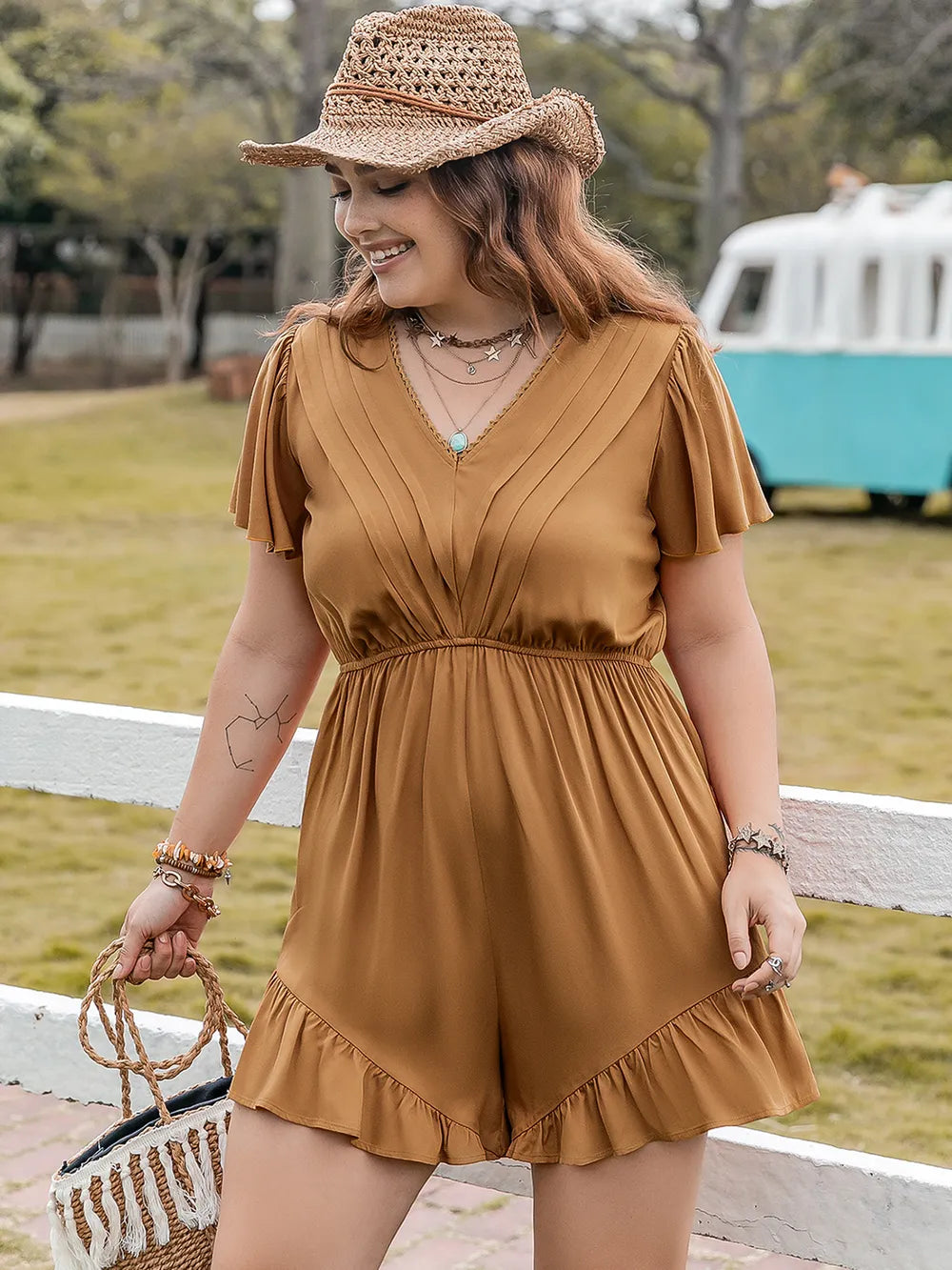 Plus Size Ruffled V-Neck Short Sleeve Romper
