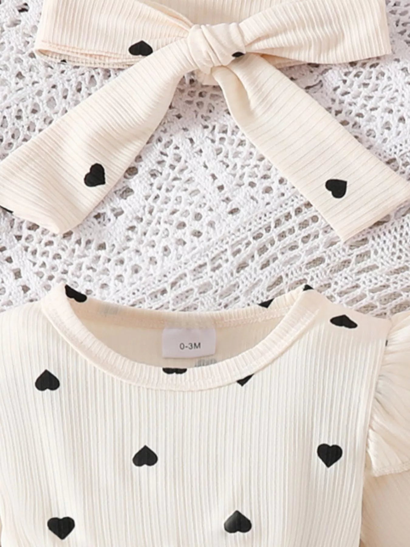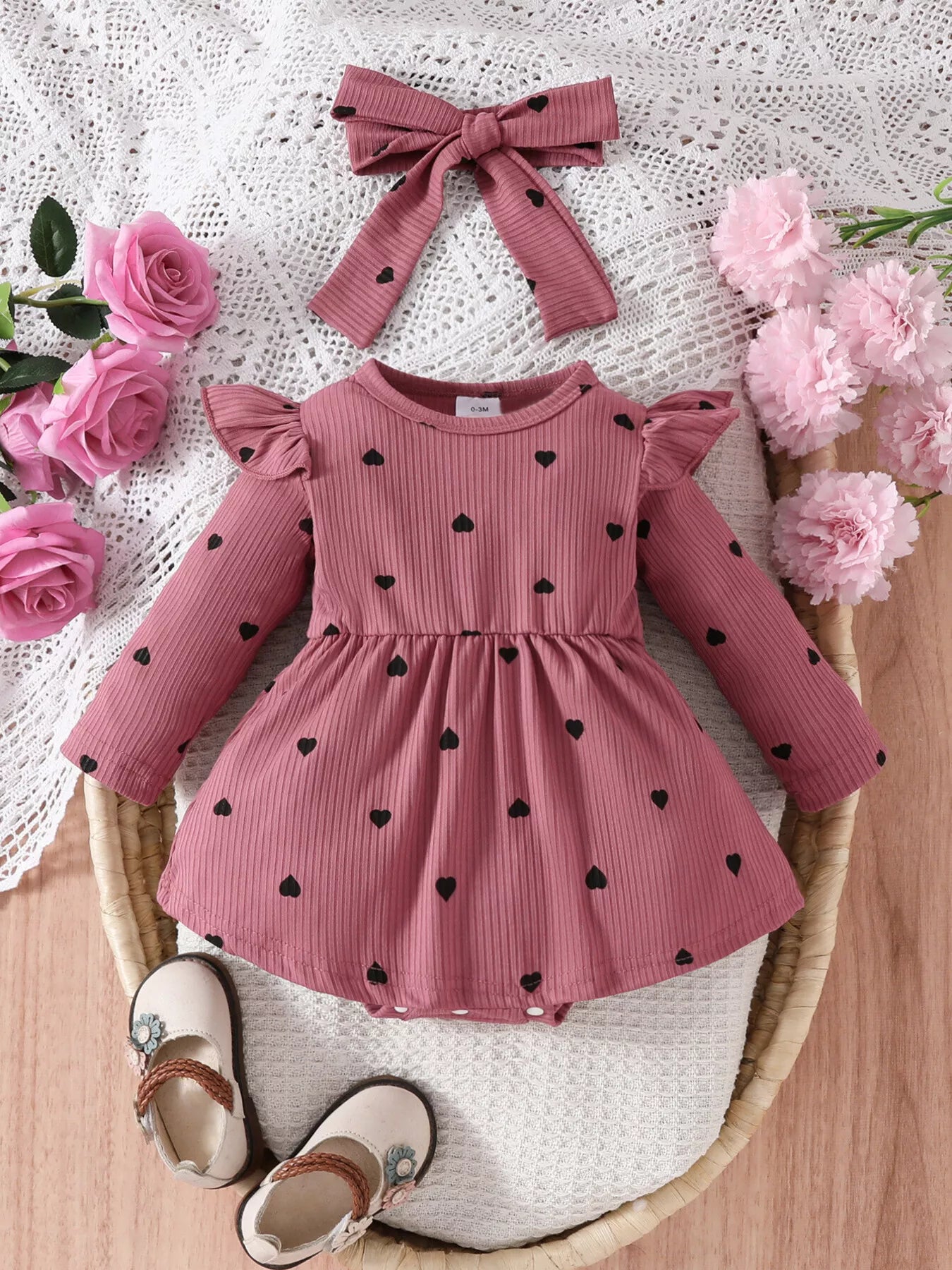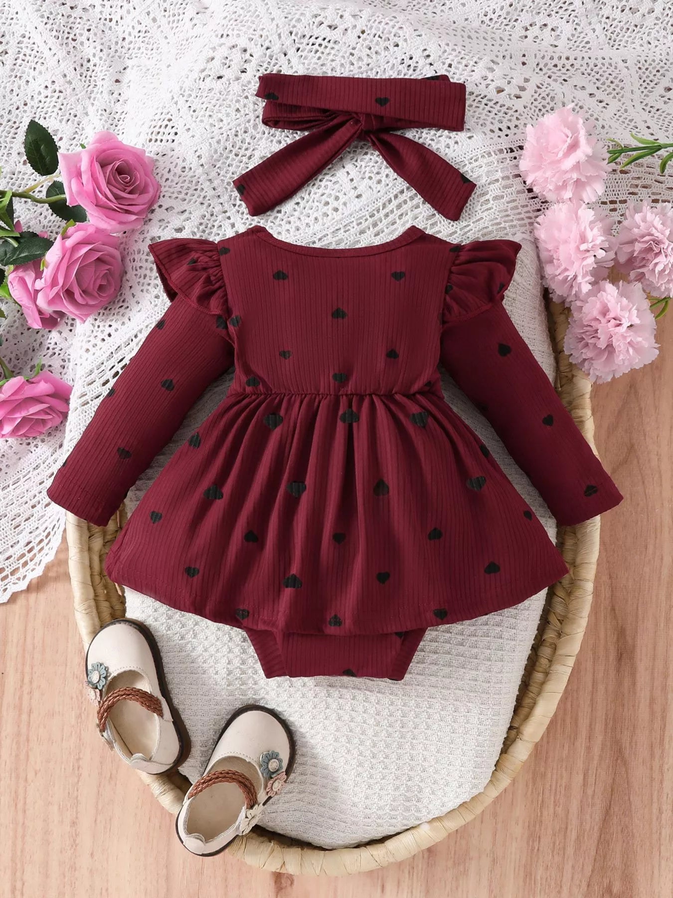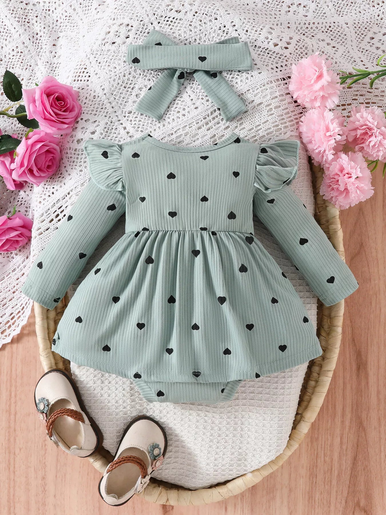 Children's Heart Print Ruffle Trim Bodysuit Dress with Headband