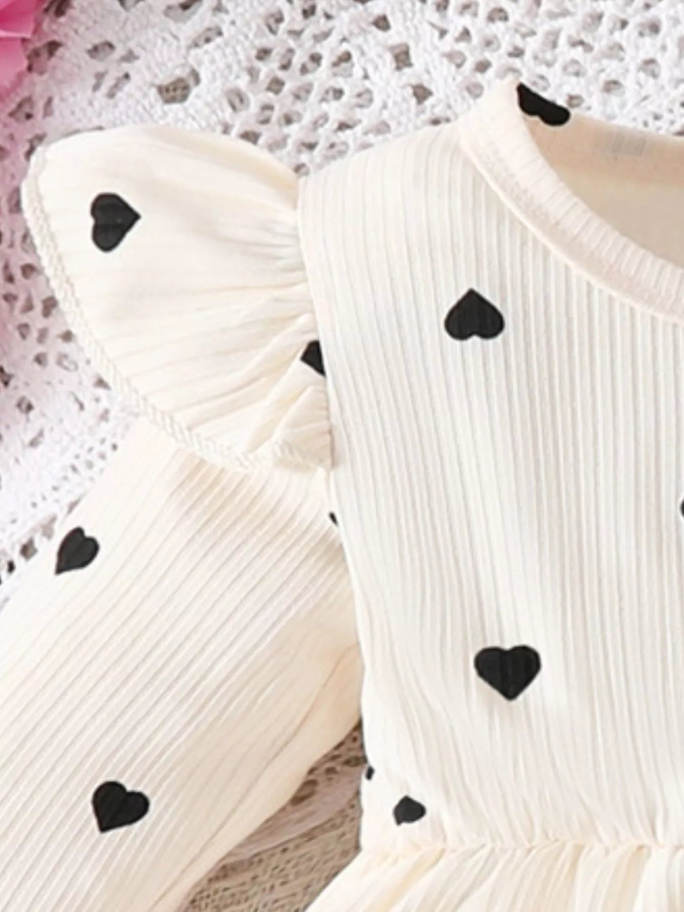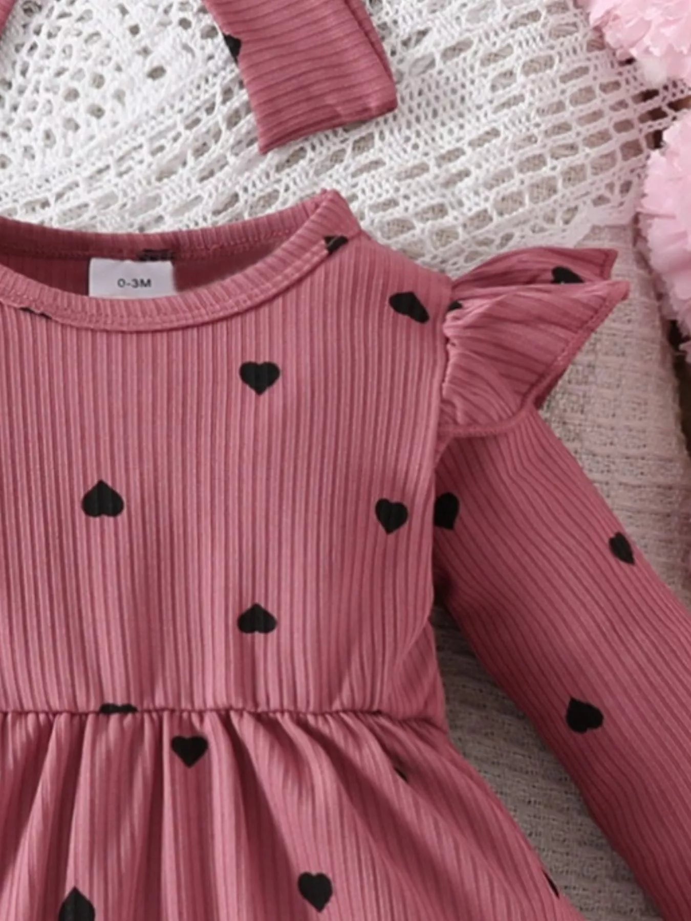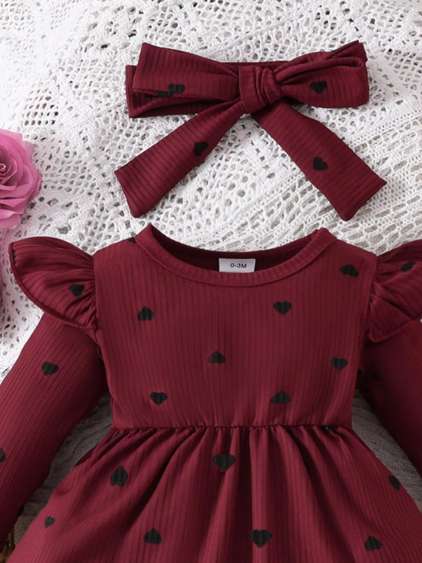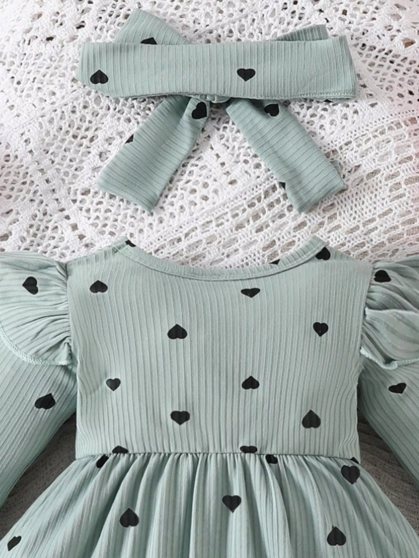 Children's Heart Print Ruffle Trim Bodysuit Dress with Headband