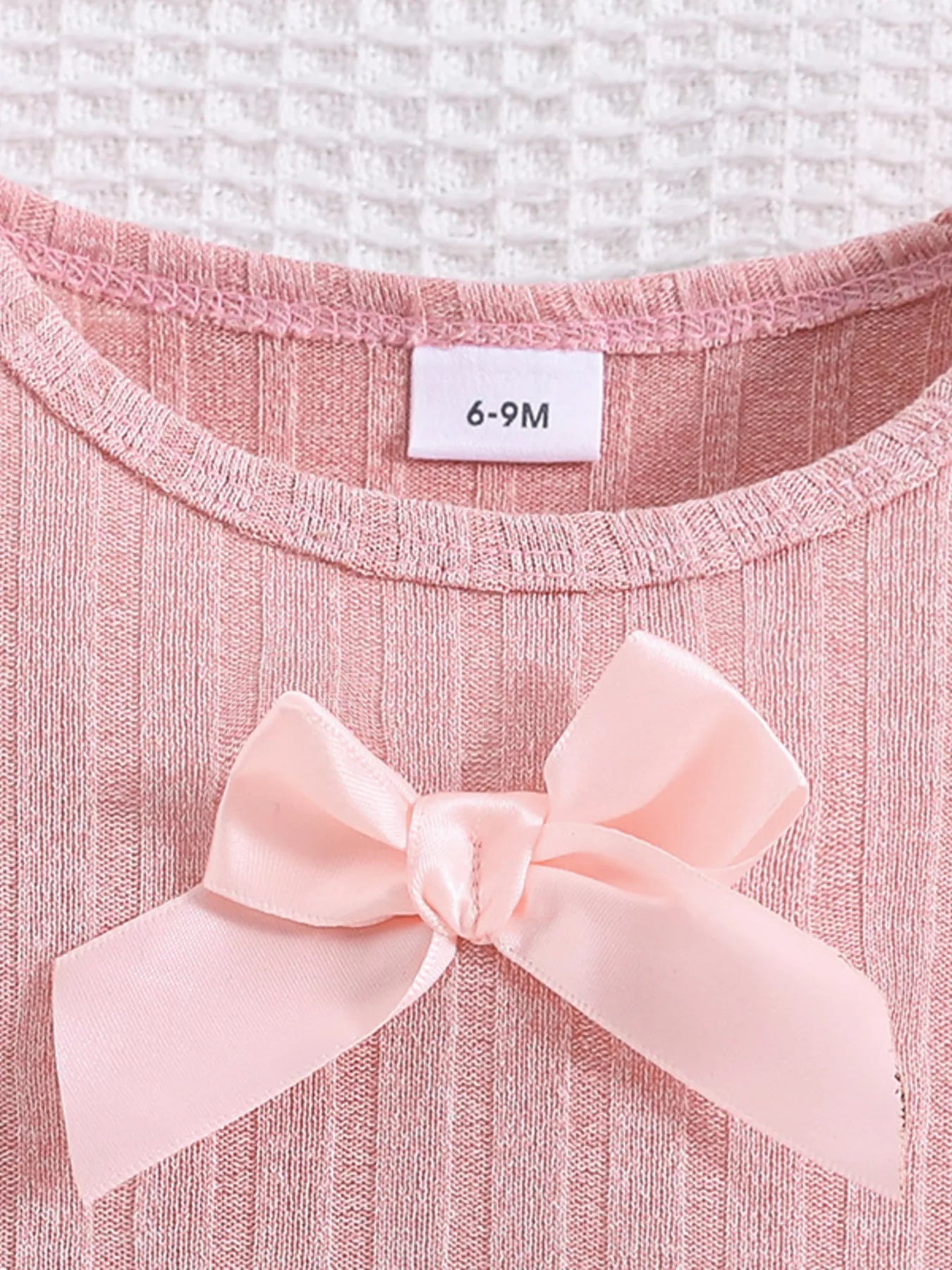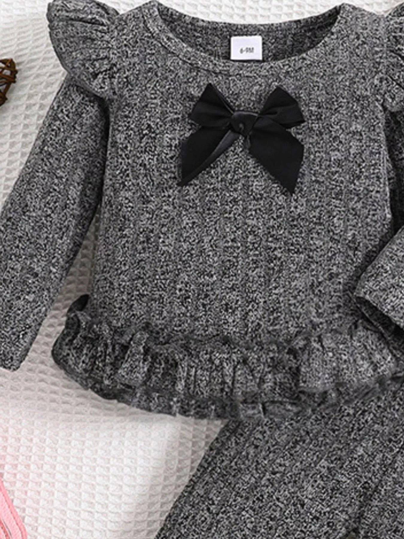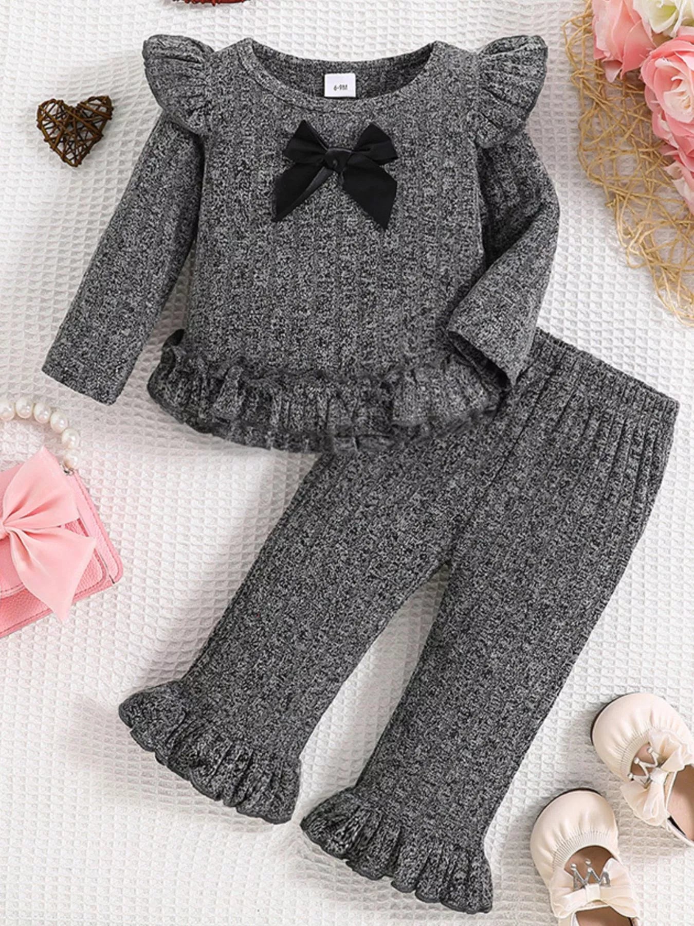 A cute and comfortable two-piece outfit featuring ruffled details and a bow accent, perfect for everyday wear.