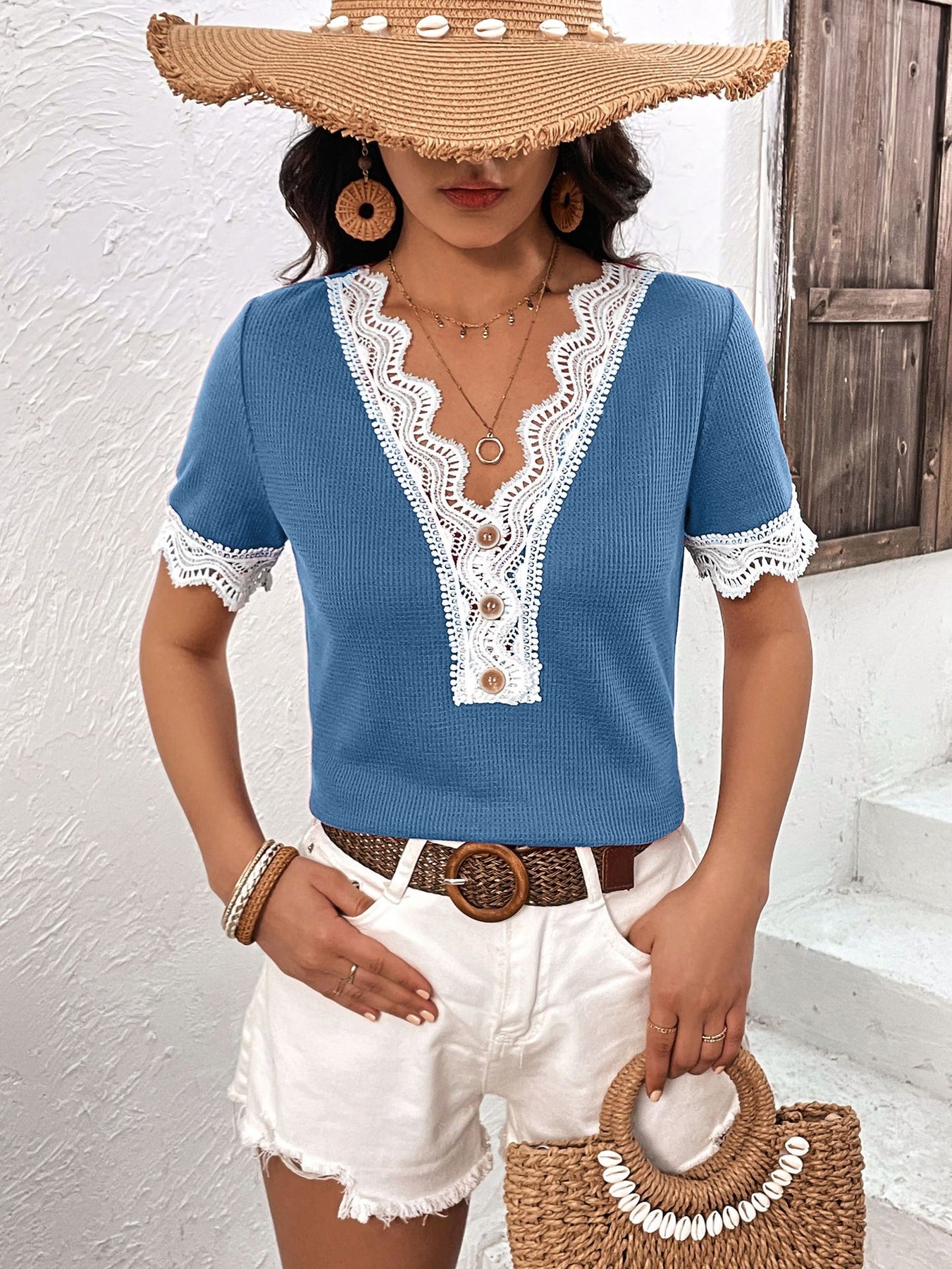 Elegant and effortlessly chic, this lace-accented top features a flattering V-neckline and decorative buttons for a refined finish. Crafted from soft, stretchy polyester, it blends comfort and sophistication — perfect for casual days or dressed-up evenings.