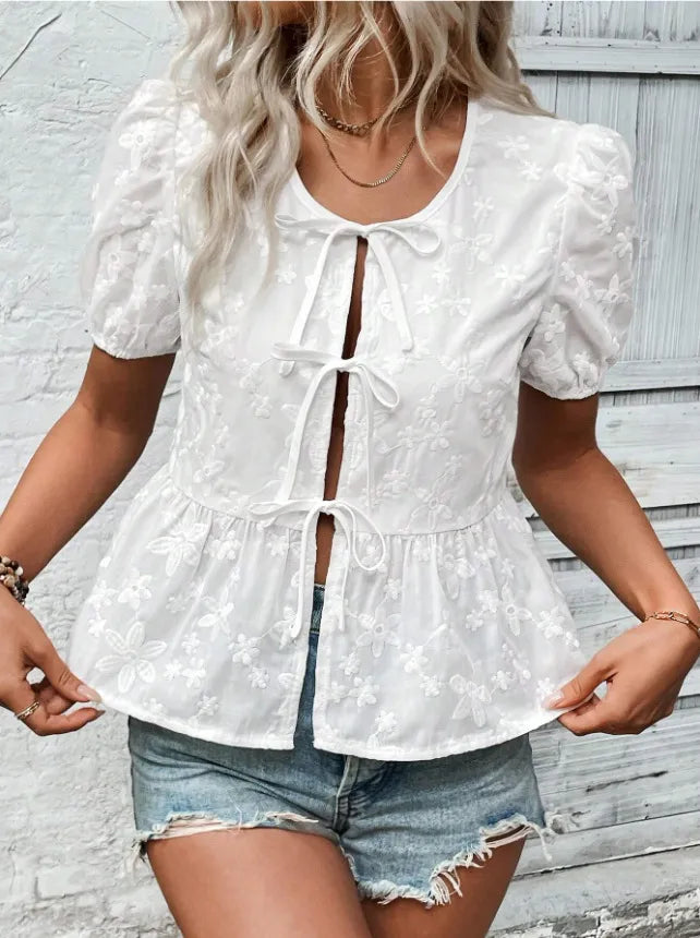 Puff Sleeve Tie Front Lace Peplum Blouse