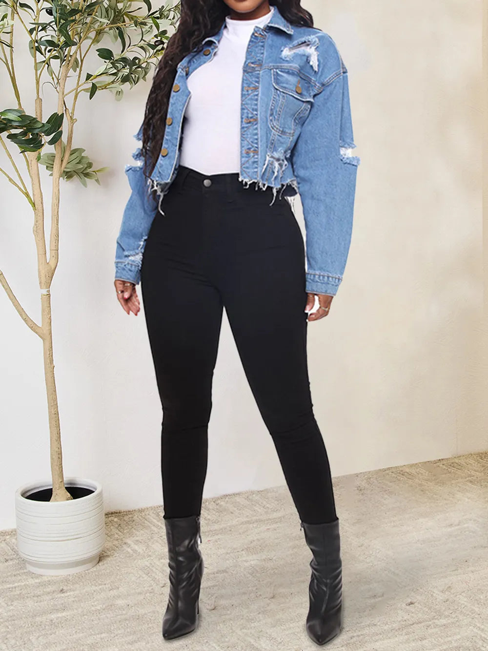 Trendy cotton-blend top with a distressed finish and raw hem, offering an edgy yet casual style. Perfect for layering or wearing as a statement piece.