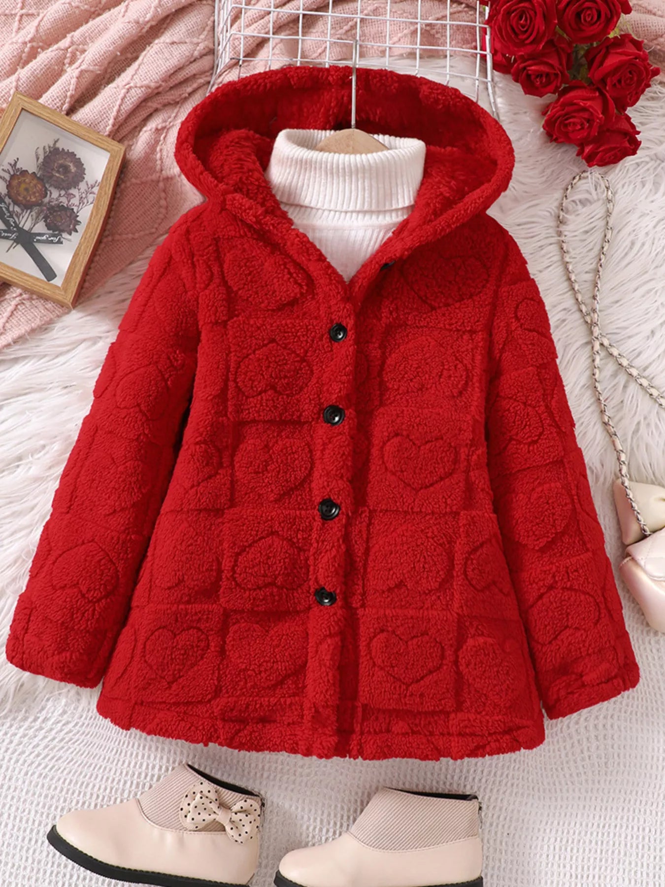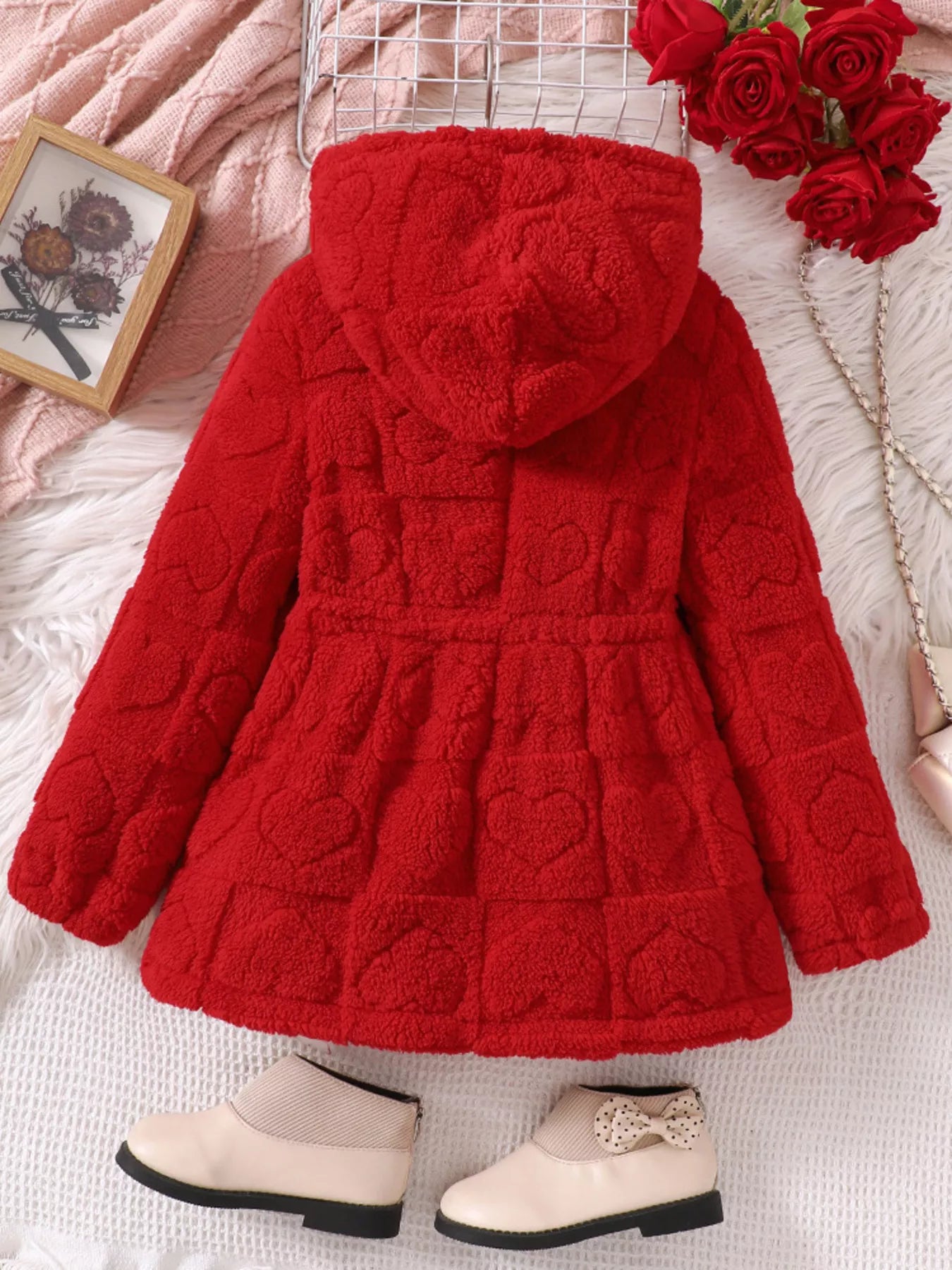 Children's Cozy Heart-Patterned Fleece Hooded Jacket