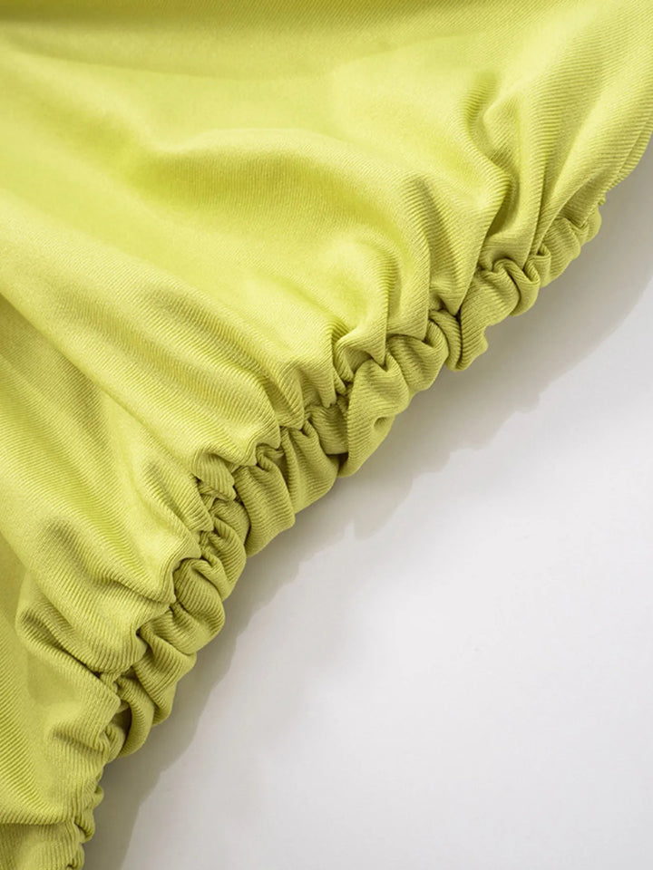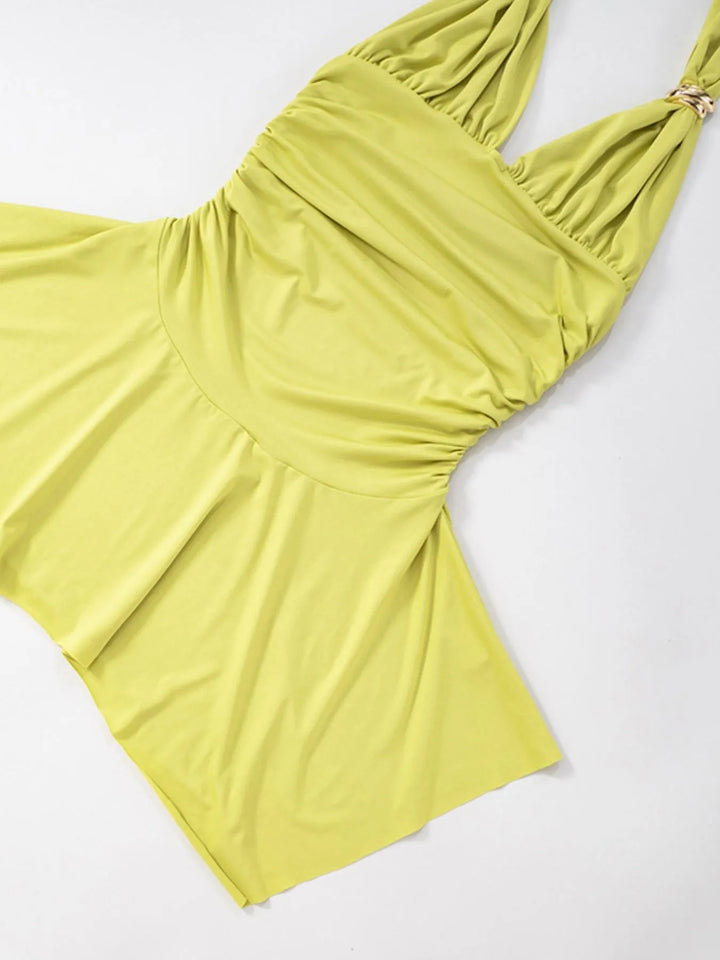 This chic asymmetrical mini dress features ruched details and tie accents, creating a flattering silhouette. Crafted from lightweight polyester with a touch of stretch, it’s perfect for nights out, parties, or elegant summer occasions.