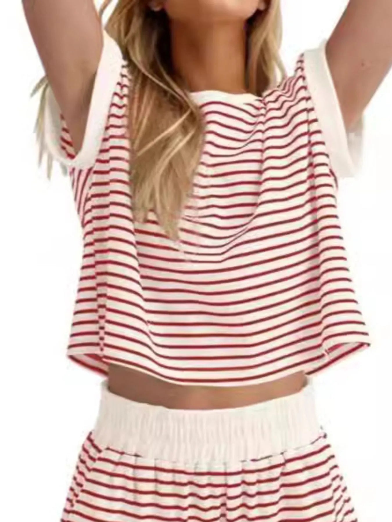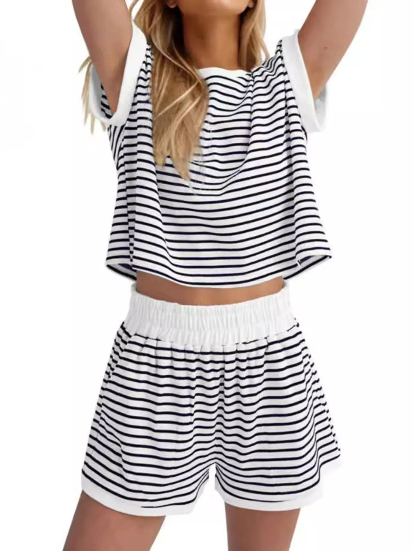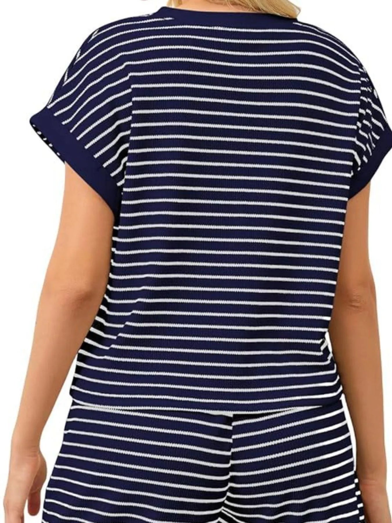 Full Size Contrast Striped T-Shirt and Shorts Set Plus Size