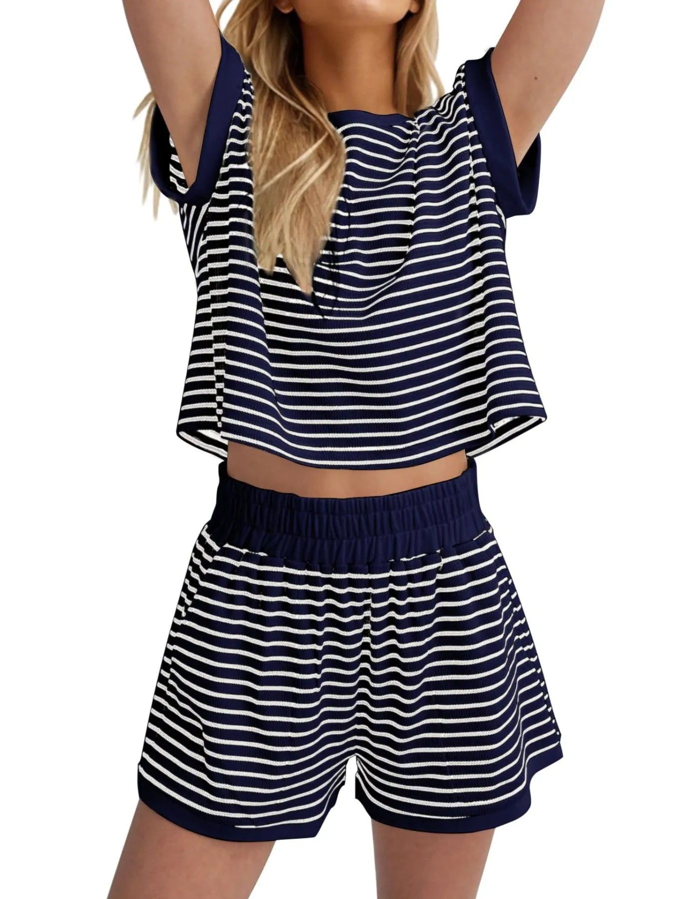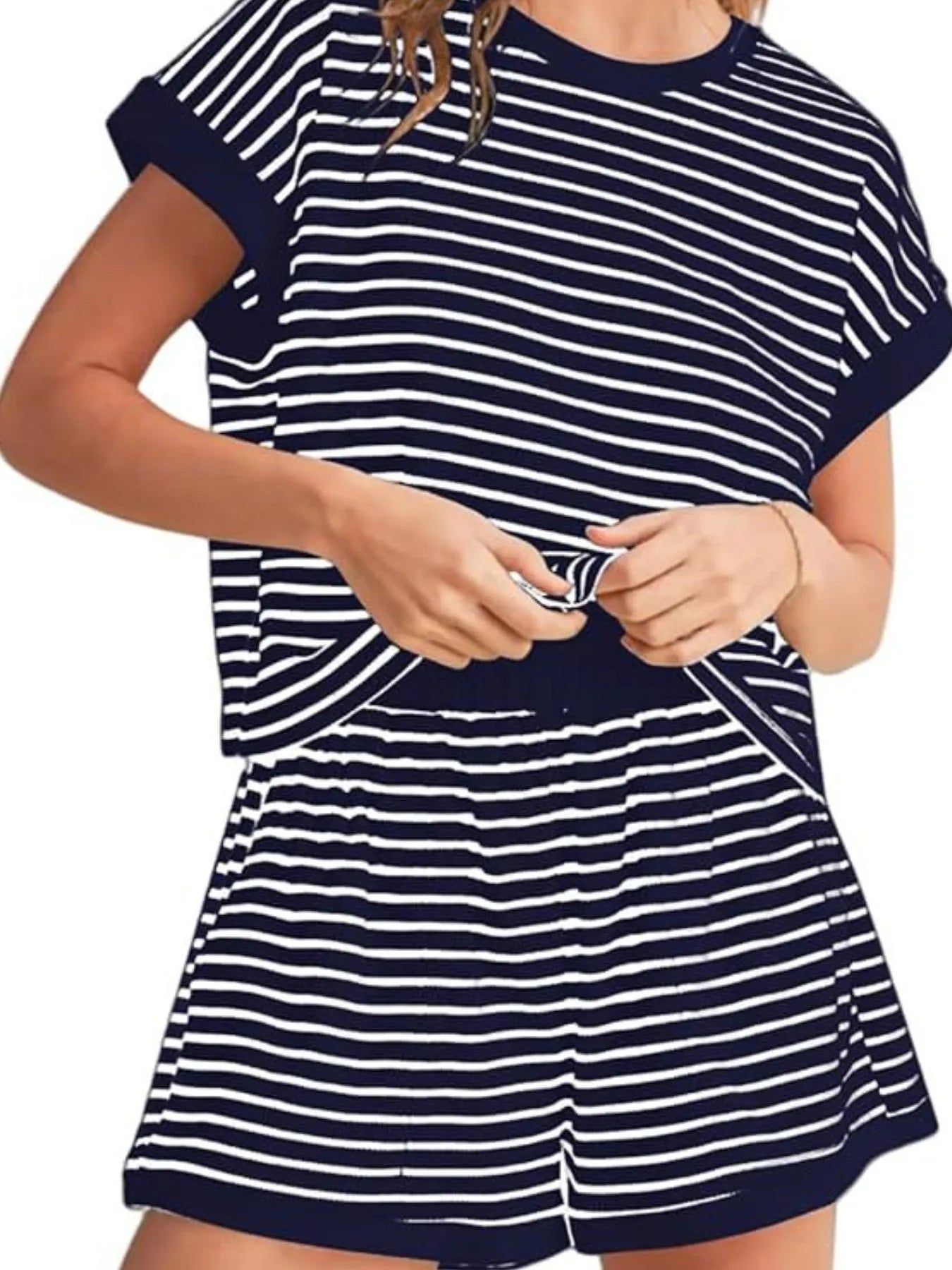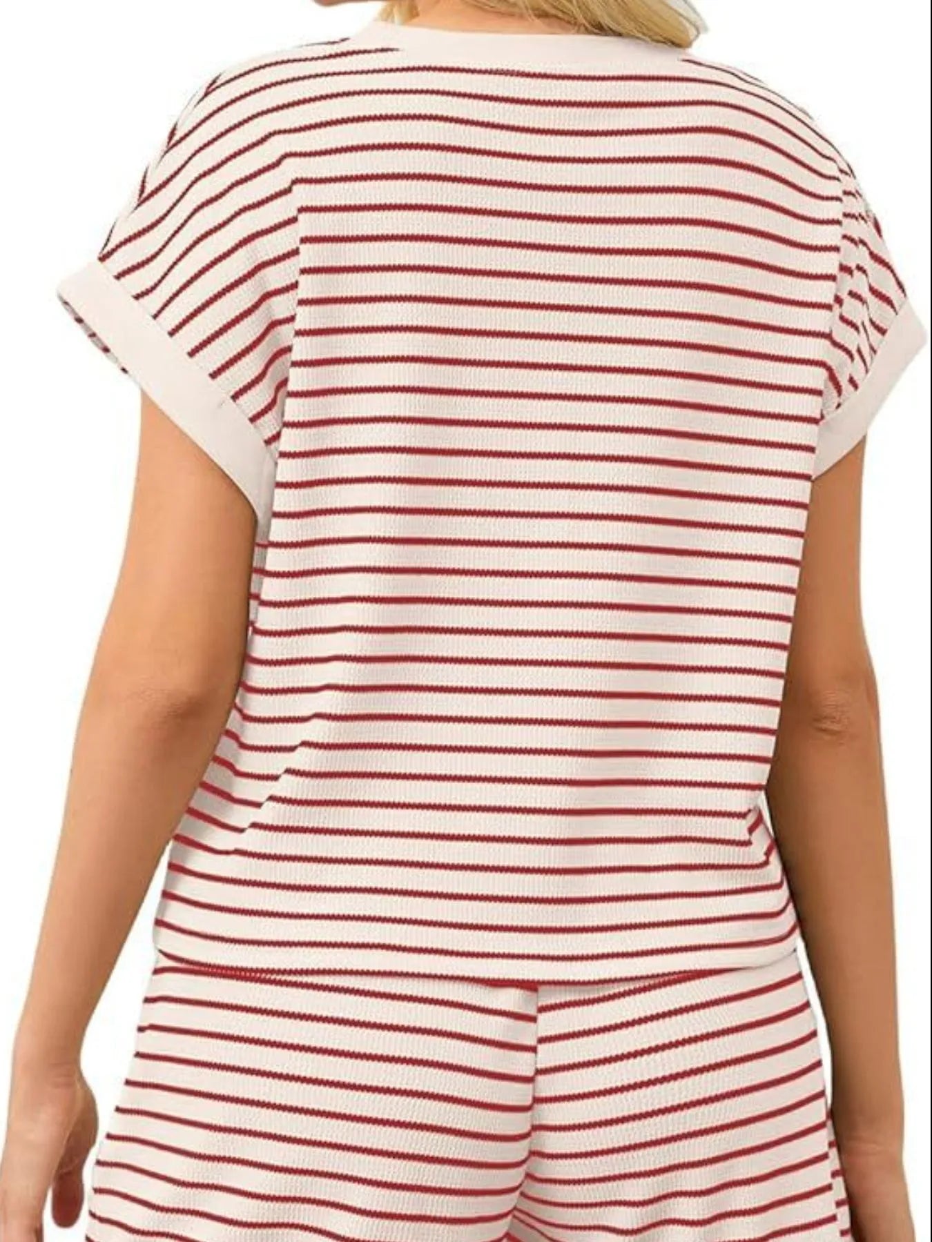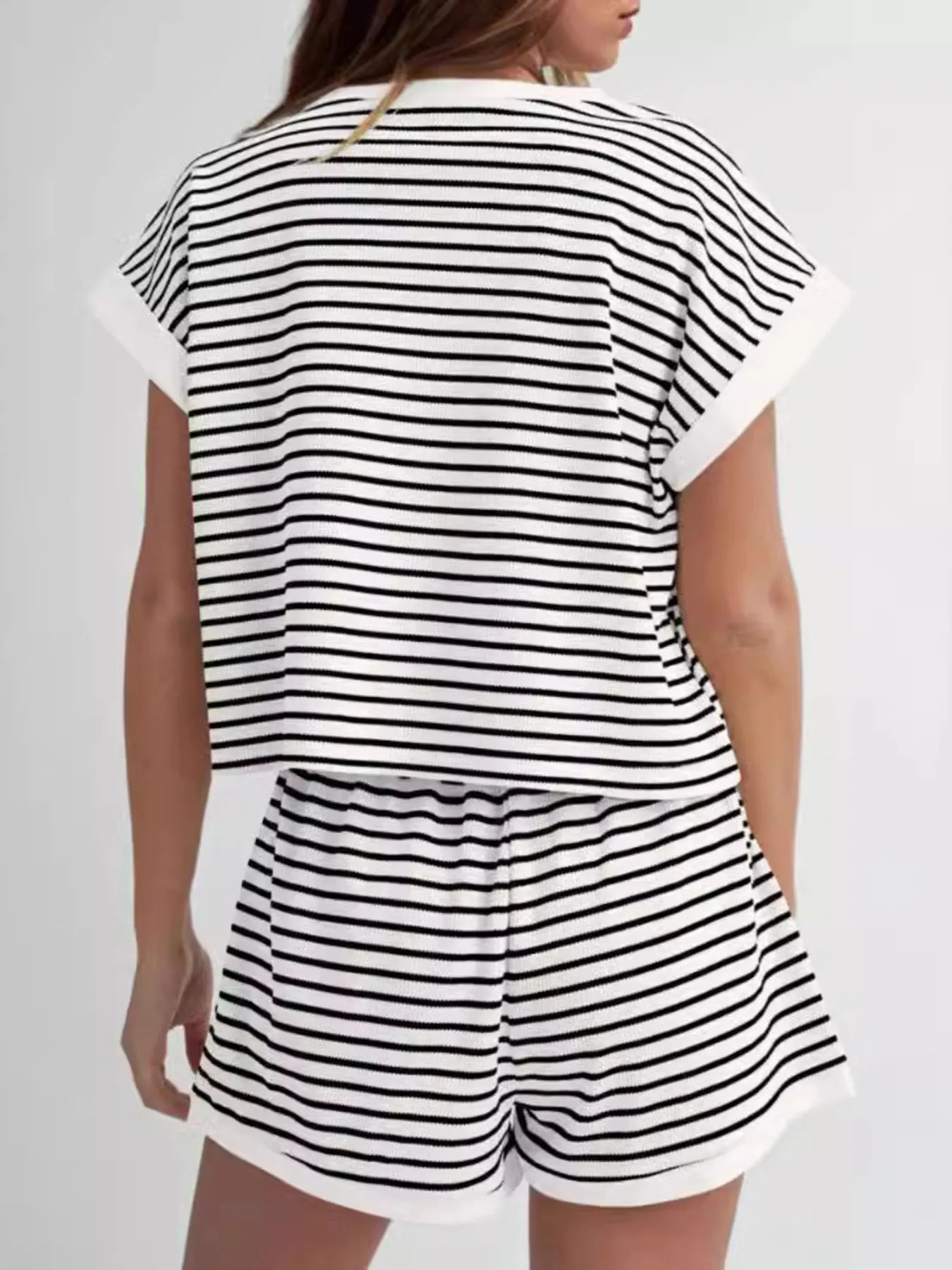 Full Size Contrast Striped T-Shirt and Shorts Set Plus Size