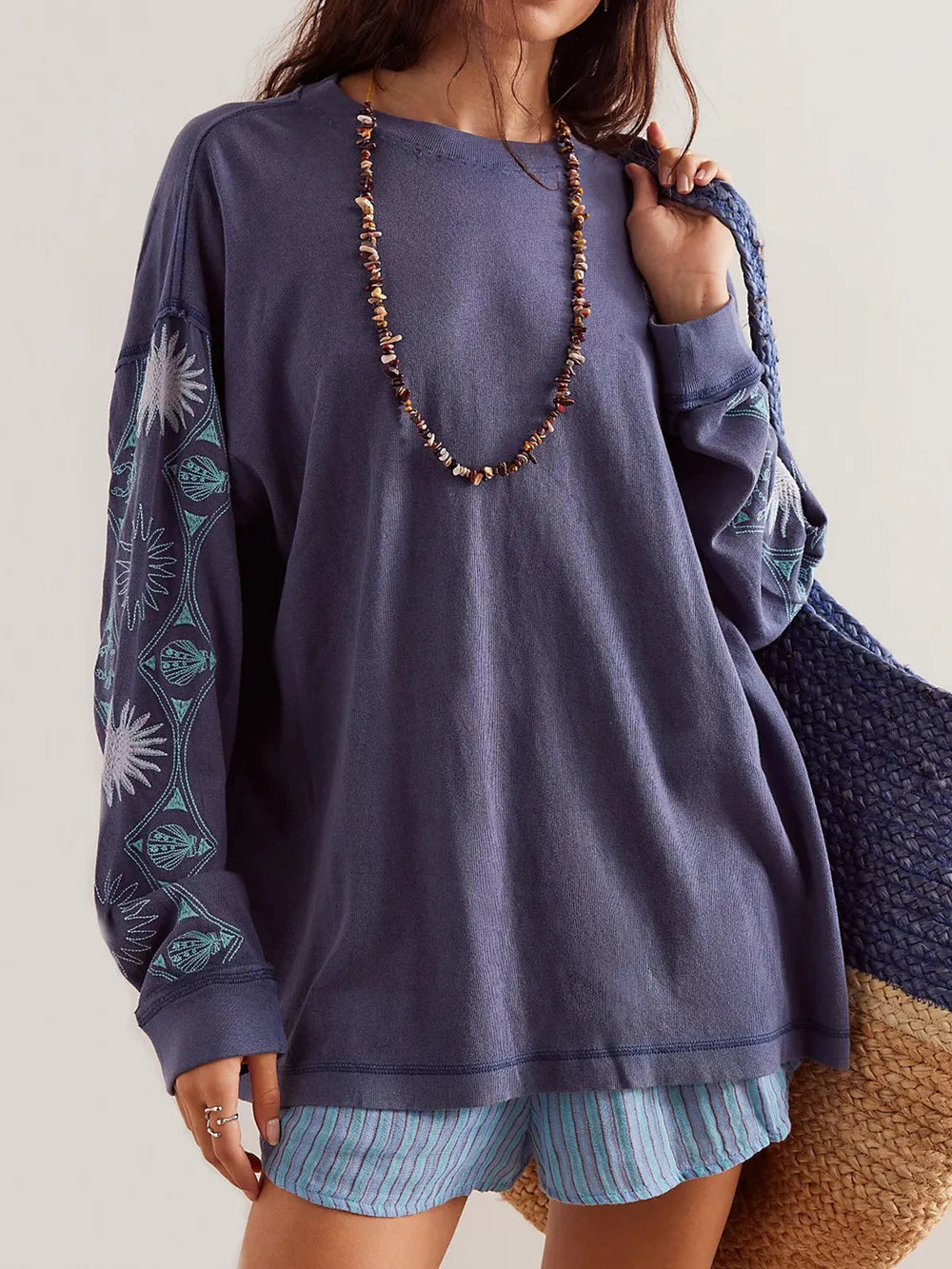 Embroidered Round Neck Long Sleeve Sweatshirt