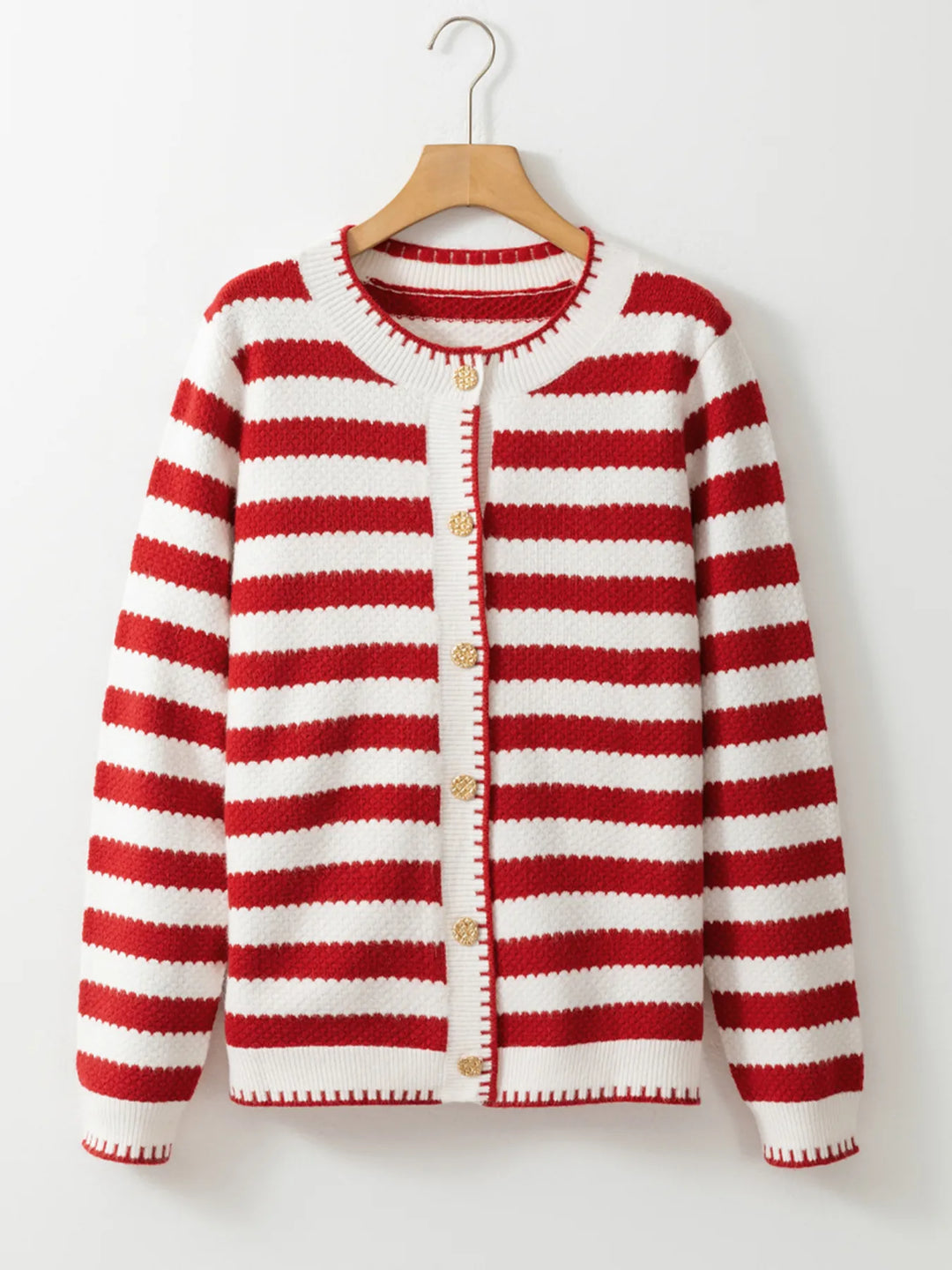 This cozy knit cardigan features a soft, slightly stretchy fabric blend and classic button-down front. Perfect for layering and adding timeless style to your everyday look.