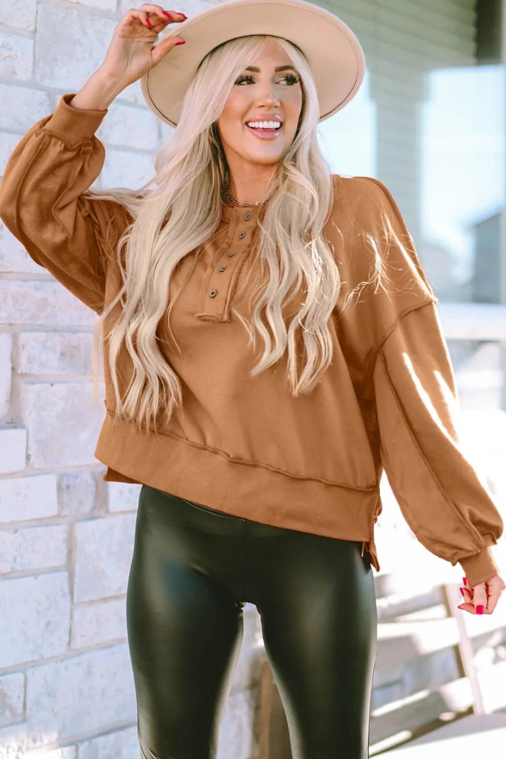 Exposed Seam Half Button Long Sleeve Sweatshirt